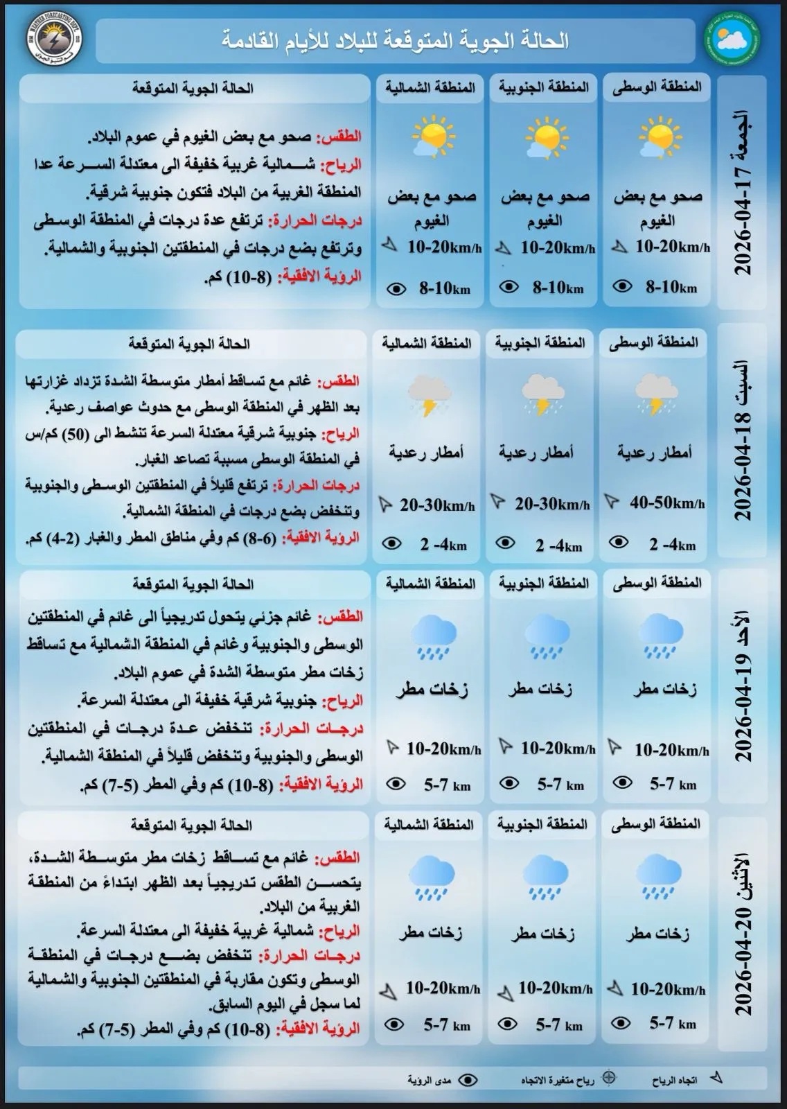 أعلنت هيئة الأنواء الجوية، اليوم الخميس، عن تفاصيل حالة الطقس في البلاد للأيام المقبلة، فيما توقعت تساقطاً للأمطار مع حدوث عواصف رعدية بداية الأسبوع القادم.