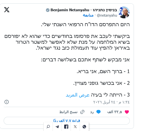 وأدرج نتنياهو هذه المعلومات ضمن بيان مطول نشره على وسائل التواصل الاجتماعي، ترافق مع إصدار تقريره السنوي للتقييم الصحي، وفقاً لصحيفة "تايمز أوف إسرائيل"