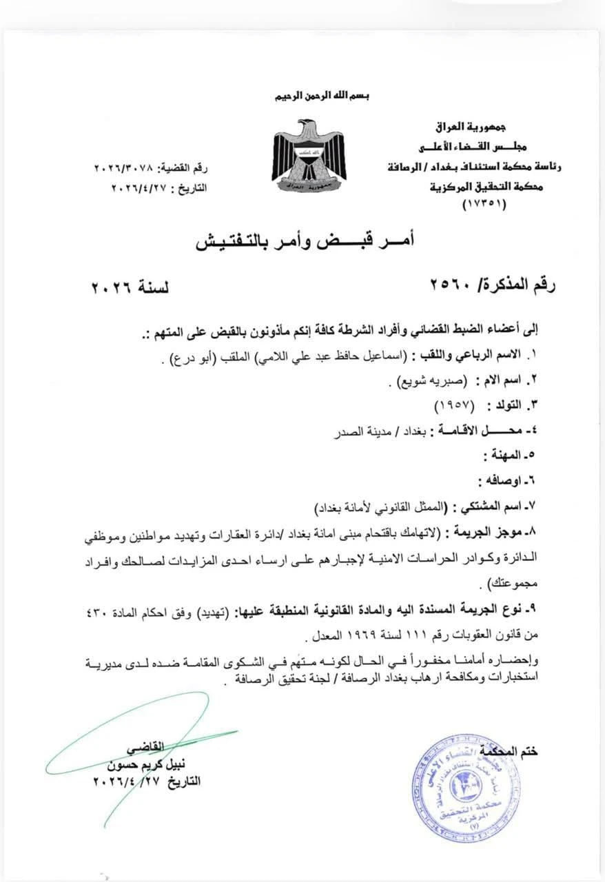 أصدرت محكمة التحقيق المركزية في بغداد، اليوم الثلاثاء، مذكرة قبض بحق المدعو إسماعيل حافظ عبد علي اللامي، الملقب بـ"أبو درع"، وذلك على خلفية شكوى رسمية قدمتها أمانة بغداد.