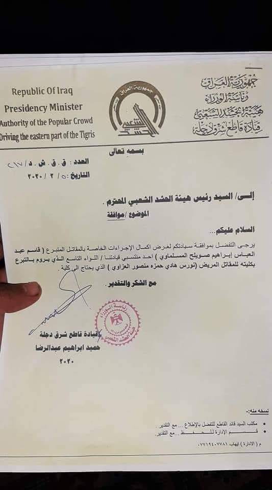 وكان مضمون وفحوى الكتاب هو طلب لاحد مقاتلي الحشد الشعبي يروم فيه الموافقة على اكمال الاجراءات التبرع باحدى كليتيه الى مقاتل مريض اخر من منتسبي الحشد الشعبي.