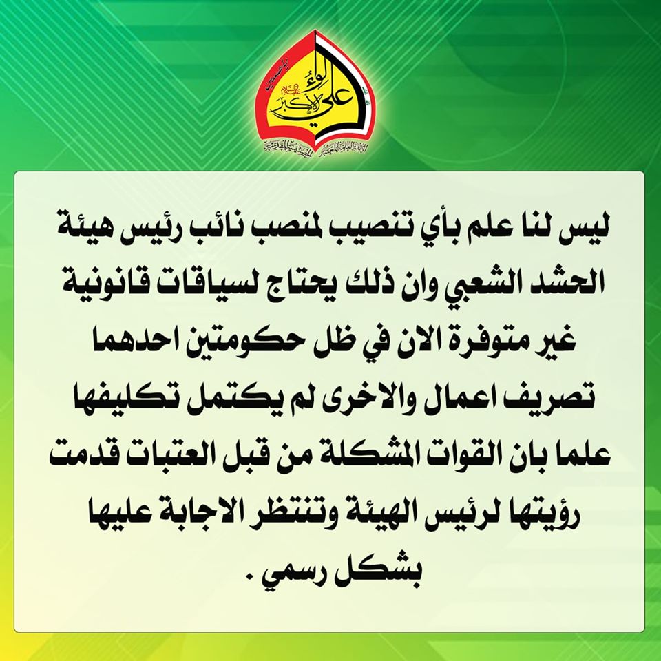 وقال اللواء على صفحته الرسمية وتابعته وكالة نون "ليس لنا علم بأي تنصيب لمنصب نائب رئيس هيئة الحشد الشعبي وان ذلك يحتاج لسياقات قانونية غير متوفرة الان في ظل حكومتين احدهما تصريف اعمال والاخرى لم يكتمل تكليفها علما بان القوات المشكلة من قبل العتبات قدمت رؤيتها لرئيس الهيئة وتنتظر الاجابة عليها بشكل رسمي .