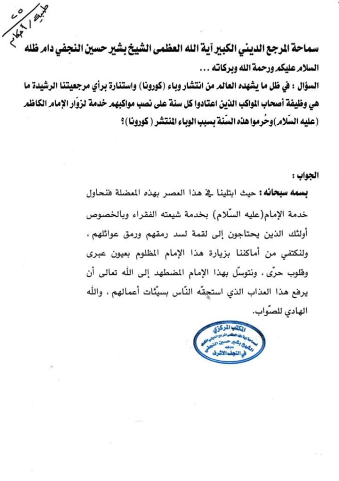 اصدر مكتب المرجع بشير النجفي بيان اوصى الى زيارة الامام الكاظم عليه السلام من اماكنكم "عن بعد" بسبب ما تمر به البلاد والعالم من ظروف صحية استثنائية وحسب البيان ادناه