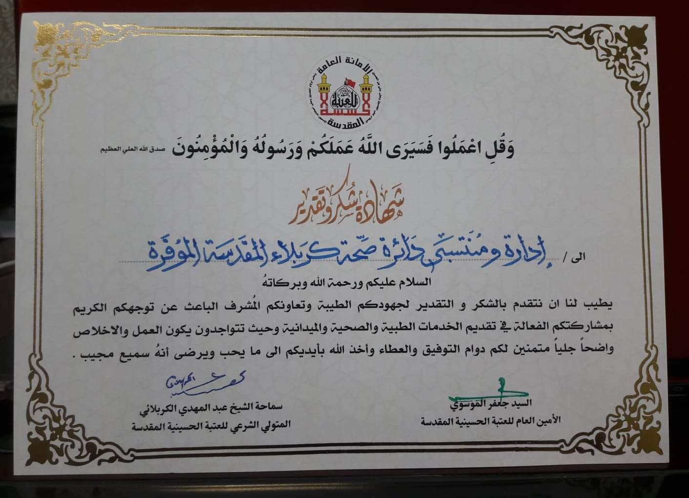 من جانبه ، نقل الساعدي ، تحيات وسلام المتولي الشرعي للعتبة الحُسينية المُقدسَة ، سماحة الشيخ عبد المهدي الكربلائي ، وأمينها العام ، السيد جعفر الموسوي ، إلى المدير العام للدائرة ، ومن خلاله إلى كافة العاملين في القطاع الصحي ، الذين تعاملوا مع موضوع " فيروس كورونا ، بكل جد وسعيٍ جاد منذ ظهوره ولحد اليوم ، للحيلولة دون إنتشاره في المحافظة ، وهي جهود خيَرة تركت أثراً وتفاعلاً طيباً في نفوس الجميع " . وفي ختام اللقاء ، تسَلم الموسوي من الساعدي ، شهادة تقديرية مُوقَعه من قبل سماحة الشيخ الكربلائي والسيد الموسوي ، تثميناً وتقديراً وعرفاناً منهما لجزيل العمل الإنساني والجُهود المُتميزة لمنتسبي الدائرة ، لأجل مُواجهة خطر الفايروس والحفاظ على سلامة وصحة وسلامة المُواطنين ، مُتمنياً لهم المُوفقية والسداد والنجاح بعملهم ، ويُسدد الله تعالى خُطاهم لما يحبَه ويرضاه " .