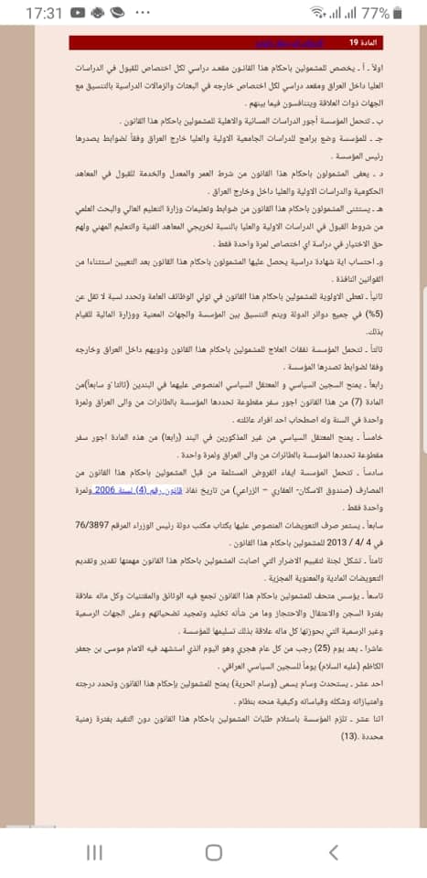 ٣-نفقات العلاج لهم ولذويهم داخل العراق وخارجه تتحملها الخزينة العامة.