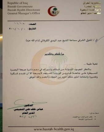 وبيّن كتاب صادر عن دائرة صحة البصرة حصلت وكالة نون الخبرية أنّه بالنظر للدعم المتواصل من قبل الأمانة العامة للعتبة الحسينية والمتمثل بسماحة الشيخ عبد المهدي الكربلائي ودوره المباشر في دعم دائرة صحة البصرة للسيطرة على جائحة فيروس كورونا المستجد خاصة مع تزايد عدد الإصابات في الفترة الأخيرة.