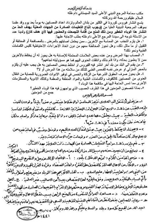 نشرت وزارة الصحة والبيئة، الجمعة، مقطعاً من نص فتوى المرجع الديني الأعلى علي السيستاني حول فيروس كورونا.