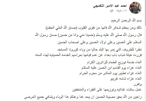 واعلنت مواكب بطلة كربلاء وعشاق الحسين وصنف القندرجية شباب باب بغداد عدم اقامتهم الشعائر والتطبير والتشابيه وتوزيع الطعام خلال محرم الحالي حيث قرر بعض اصحاب هذه المواكب الى نشر السواد وتوزيع الطعام على الفقراء والمحتاجين بسبب الظروف الصحية التي يمر بها العراق