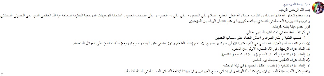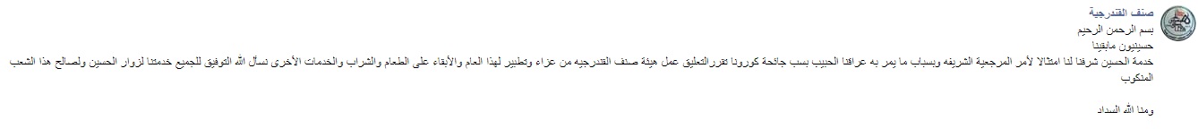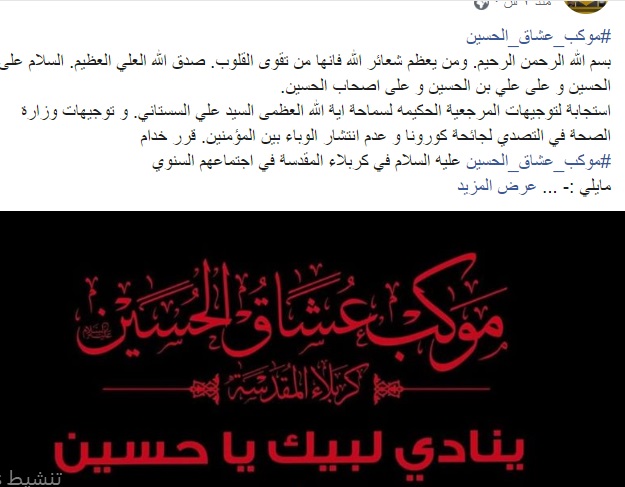 بادرت عدد من المواكب الحسينية في كربلاء الى عدم اقامتها بعض المراسيم الحسينية العاشورائية التي تشهد تجمعات كبيرة امتثالا لاوامر المرجعية الدينية العليا وتوجيهات وزارة الصحة للحد من انتشار فايروس كرورنا بين المؤمنين