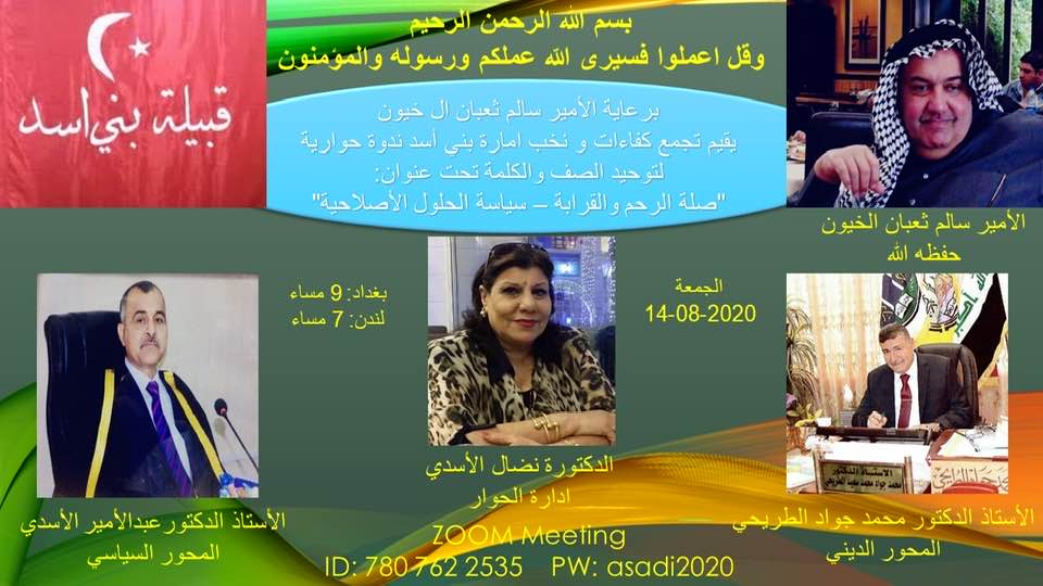 تقيم قبيلة بني اسد بالعراق اول ندوة حوارية عبر منصة زوم تناقش ايجاد الحلول للمشاكل التي يمر بها المجتمع العراقي ومنها قبيلة بني اسد العريقة اضافة الى صلة الرحم وشد روابط التجمع بين كفاءات ابناء القبيلة التي تعتبر جزء لايتجزأ من المجتمع العراقي