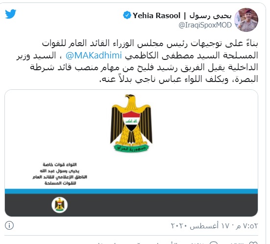 أقال رئيس الحكومة العراقية، مصطفى الكاظمي، قائد شرطة البصرة، رشيد فليح.
