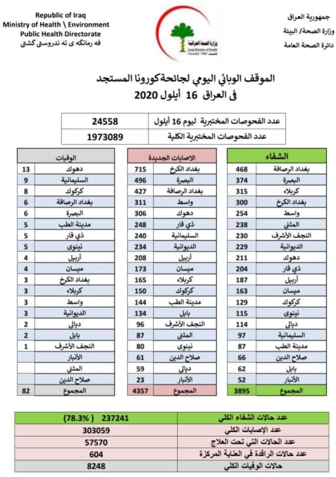 أعلنت وزارة الصحة العراقية، الاربعاء، تسجيل 82 حالة وفاء و4357 إصابة جديدة بفيروس كورونا قابلتها 3895 حالة تعافٍ من المرض.