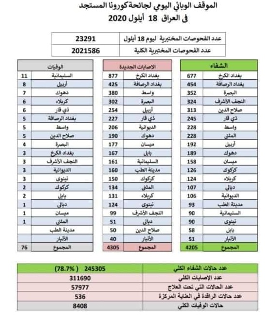 أعلنت وزارة الصحة، الجمعة، تسجيل 4305 اصابة جديدة بفيروس كورونا، و76 حالة وفاة فيما بلغت حالات الشفاء 4205 في عموم العراق كما سجلت الوزراة اصابة 131 شخص بكربلاء بالوقت الذي سجلت المحافظة 124 حالة شفاء مع 6 وفيات