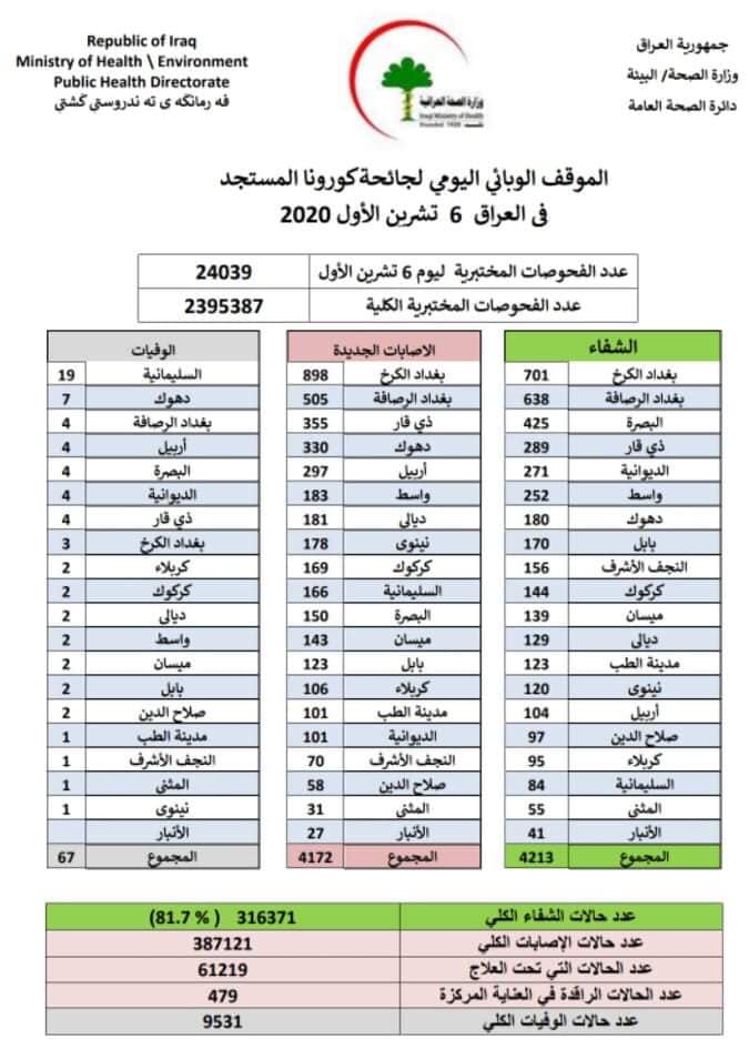 وجاء في بيان الموقف الوبائي في العراق، خلال 24 ساعة الماضية، انه "تم تسجيل 67 وفاةً و4172 اصابة جديدة بفيروس كورونا، في عموم مناطق البلاد".