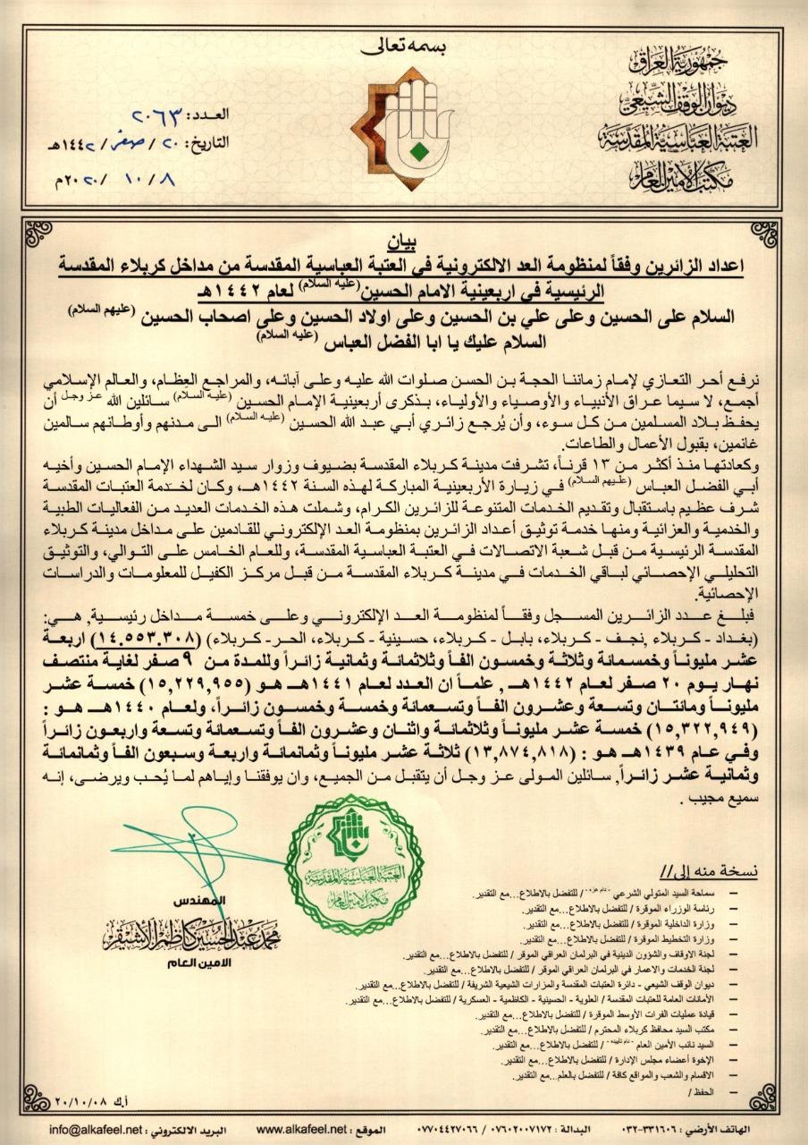 أعلنت العتبةُ العبّاسية المقدّسة بعد ظهر اليوم بياناً رسميّاً أكّدت فيه أنّ أعداد الزائرين المسجّلين وفقاً لمنظومة العدّ الإلكترونيّ، للمدّة من (9) صفر الخير ولغاية منتصف نهار (20) من صفر الخير لعام 1442هـ، بلغت (14.553.308) أربعة عشر مليوناً وخمسمائة وثلاثة وخمسين ألفاً وثلاثمائة وثمانية زائرين، دخلوا من خمسة مداخل رئيسيّة هي: (بغداد - كربلاء) (نجف - كربلاء) (بابل - كربلاء) (حسينيّة - كربلاء) (الحر – كربلاء).
