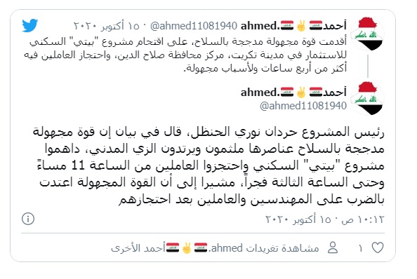 وقال رئيس المشروع حردان نوري الحنظل، إن "قوة مجهولة مدججة بالسلاح ترتدي الزي المدني ولثام الوجه، داهموا مشروع بيتي السكني واحتجزوا العاملين من الساعة الحادية عشر مساءً وحتى الساعة الثالثة صباحا"، مشيرا إلى أن "القوة المجهولة اعتدت بالضرب على المهندسين والعاملين بعد احتجازهم وسحبت هواتفهم".