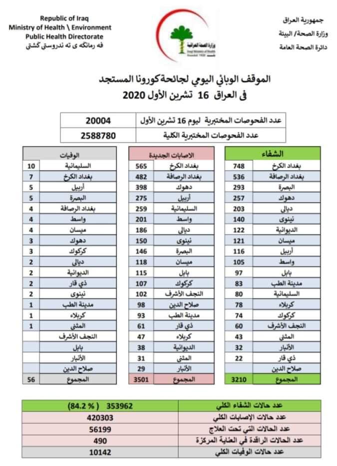 أعلنت وزارة الصحة والبيئة العراقية، يوم الجمعة، عن تسجيل 56 حالة وفاة و3501 إصابة جديدة بفيروس كورونا. فيما سجلت محافظة كربلاء المقدسة 78 حالة شفاء مع 47 اصابة بفايروس كورونا