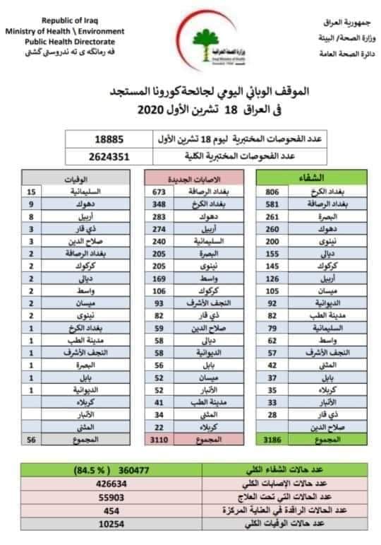 اعلنت وزارة الصحة تسجيل اكثر من 3000 اصابة بكورونا بالعراق كما سجلت اكثر من 3000 متعافي من فايروس كورونا بعموم البلاد في الوقت الذي تذيلت كربلاء القائمة باعداد المصابين دون تسجيل اي حالة وفاة خلال ال24 ساعة الماضية