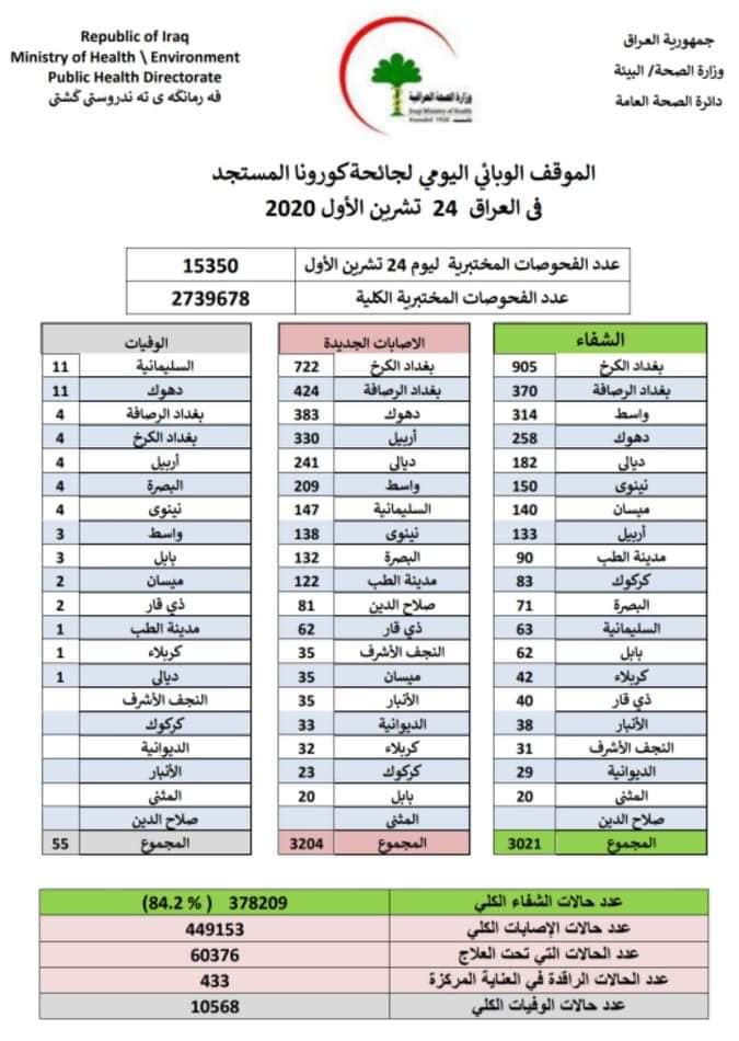 وبحسب جدول توضيحي صادر عن الوزارة وتلقته وكالة نون الخبرية، فان "دوائر الوزارة سجلت خلال الـ 24 ساعة الماضية، 3204 إصابات جديدة بفيروس كورونا المستجد، ليرتفع إجمالي الإصابات إلى 449153 إصابة في عموم العراق".