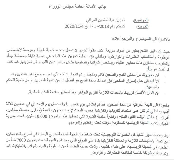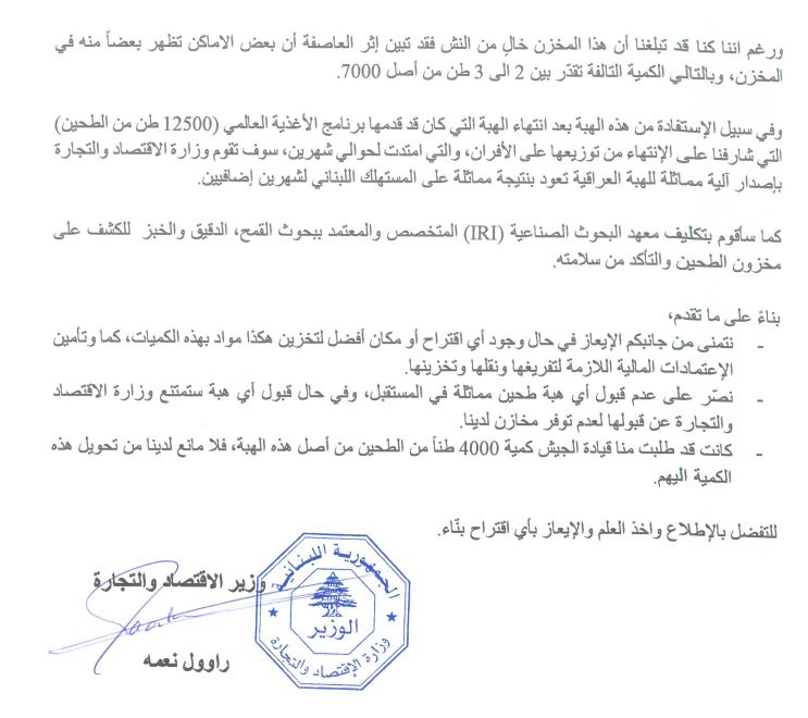 وجّه وزير الاقتصاد في حكومة تصريف الاعمال اللبنانية راوول نعمة كتابا الى الامانة العامة لمجلس الوزراء بشأن تخزين هبة الطحين العراقي.