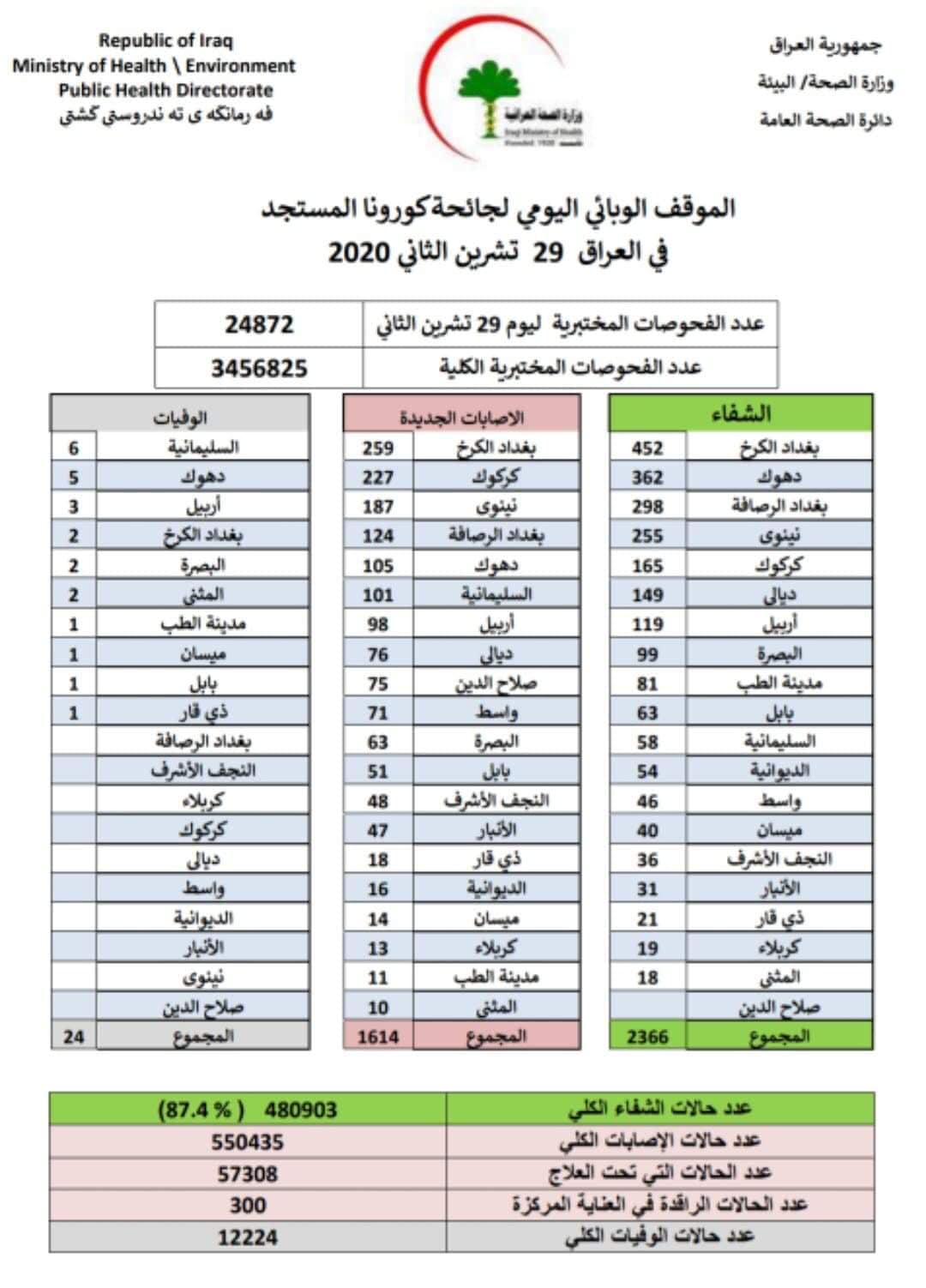 وقالت الوزارة في بيان، تلقته وكالة نون الخبرية: ان “مختبراتها سجلت 1614 اصابة جديدة بجائحة كورونا فيما بلغت حالات التعافي من الوباء 2366 حالة في عموم العراق خلال الـ 24 ساعة الماضية”.