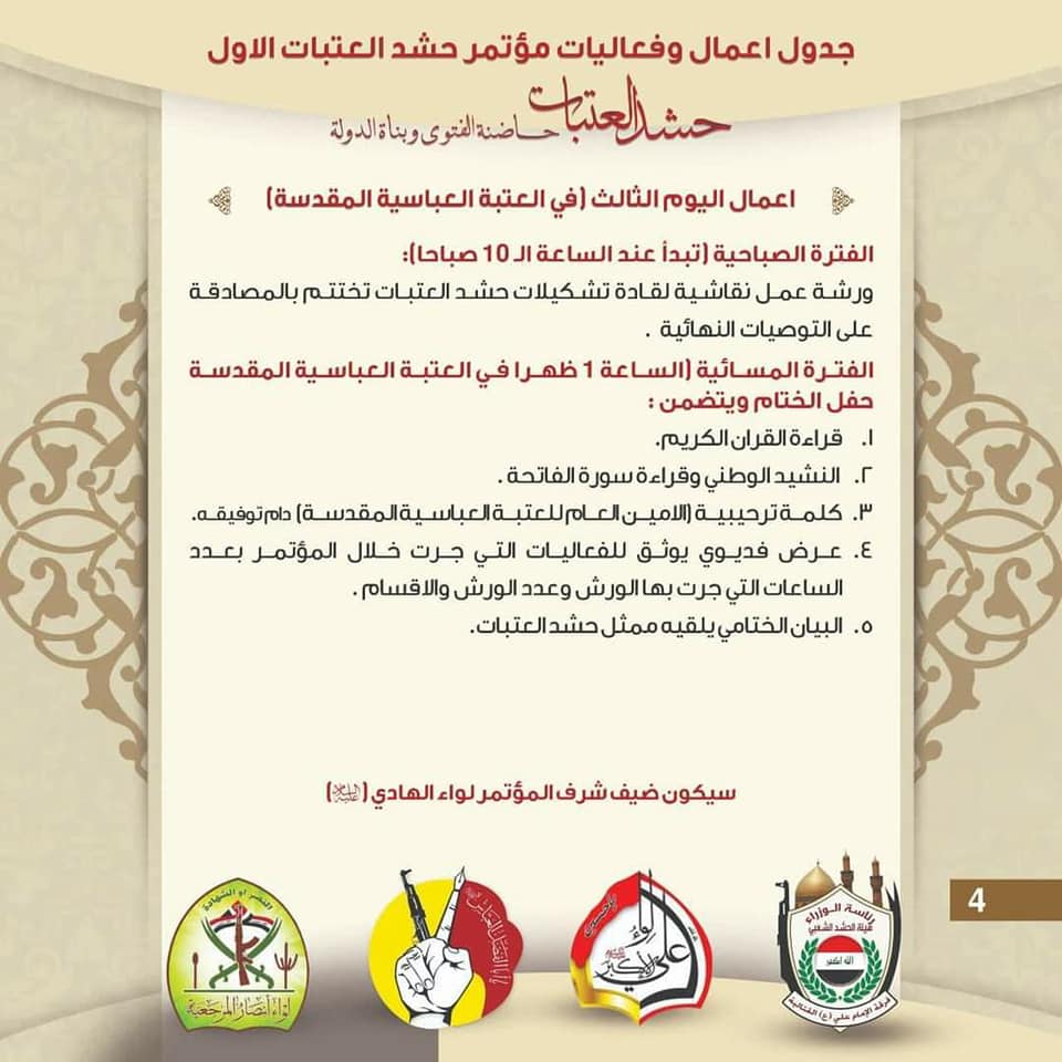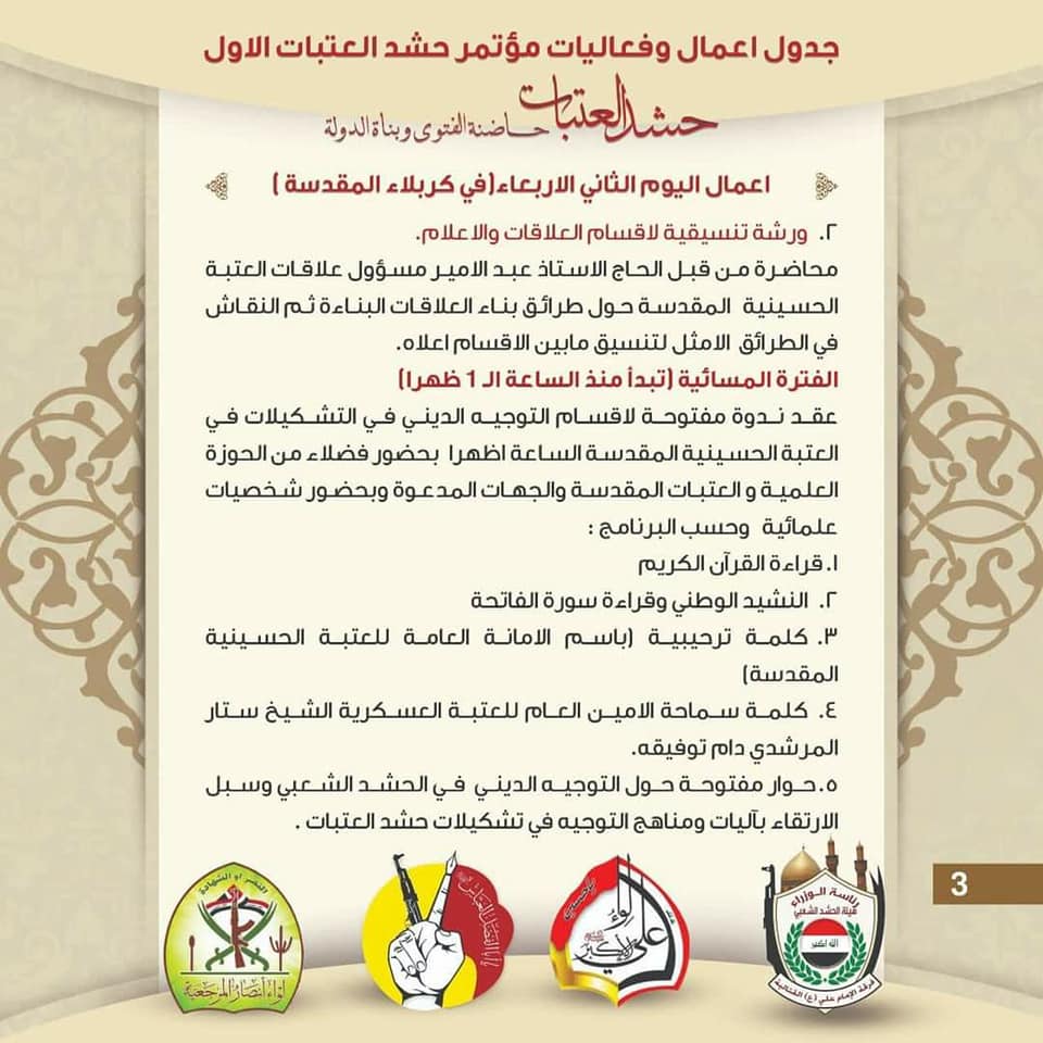 وتابع، "وستتمّ استضافة عدد من الشخصيات للحضور والمشاركة في هذه الورش، على أن تُختتم فعّاليات هذا المؤتمر في العتبة العبّاسية المقدّسة مساء يوم الخميس (3 كانون الأول 2020)، مبينا أن "حفل الختام سيتضمّن فقرات عديدة من ضمنها إلقاء توصيات تخصّ المؤتمر"