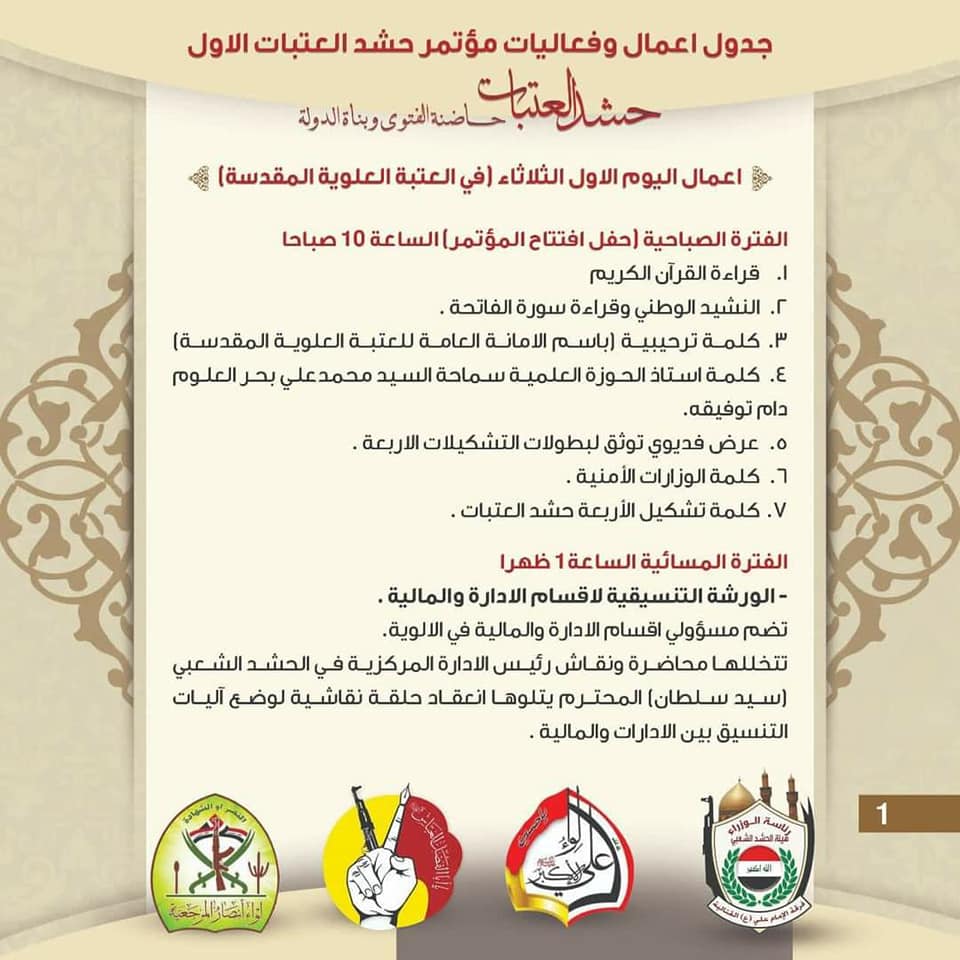 أعلنت قيادات حشد العتبات المقدسة الإثنين، عزمها تنظيم أول مؤتمر موحد يوم غد الثلاثاء تحت شعار "حشد العتبات حاضنة الفتوى وبناة الدولة".