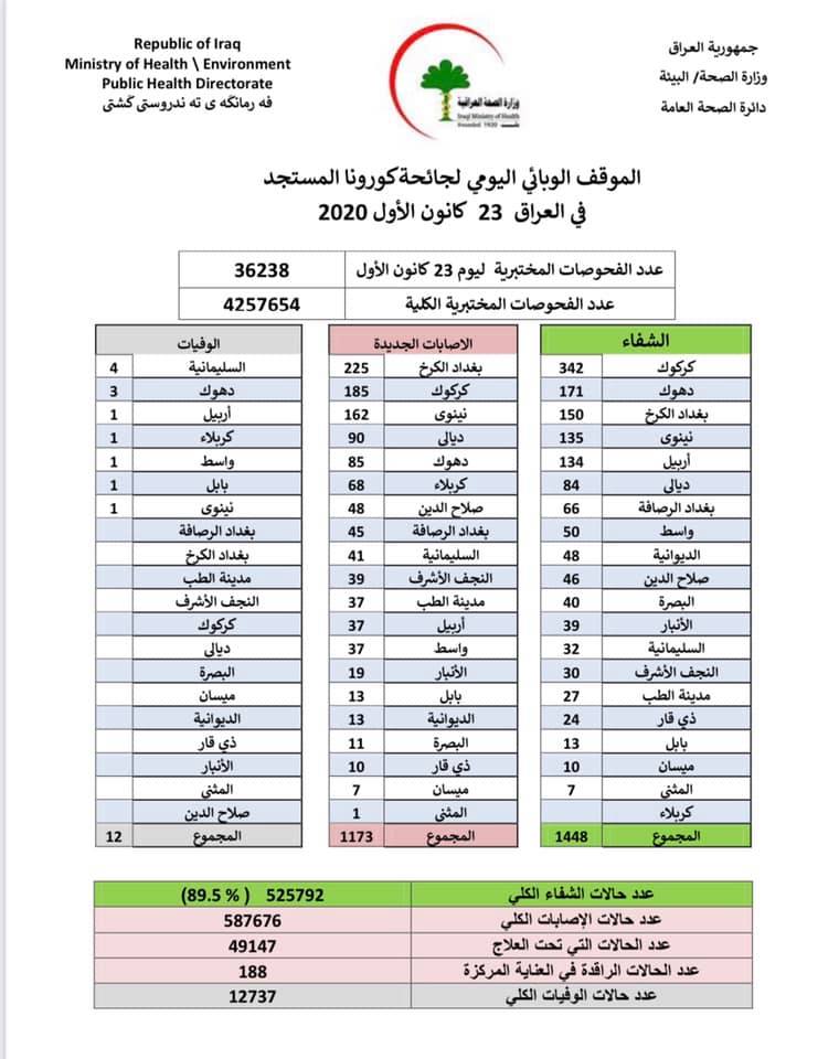 وذكرت الوزارة في بيان تلقت وكالة نون الخبرية، نسخة منه، انه" تم تسجيل ١٤٤٨ حالة شفاء من فيروس كورونا، فضلا عن ١١٧٣ اصابة جديدة، بالاضافة الى ١٢ حالة وفاة".