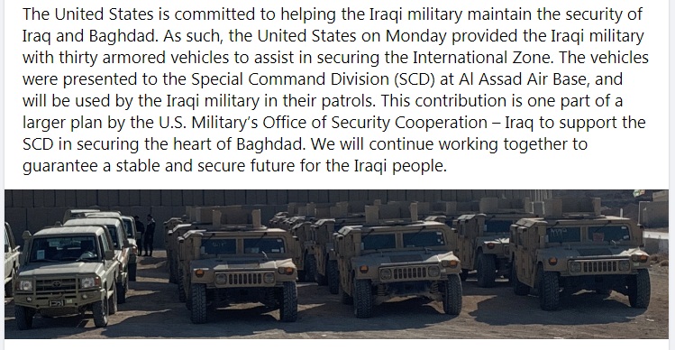 واضاف ان امريكا قدمّت المركبات المذكورة لفرقة القيادة الخاصة والكائنة في قاعدة الأسد الجوية، وسيستخدمها الجيش العراقي في دورياته".