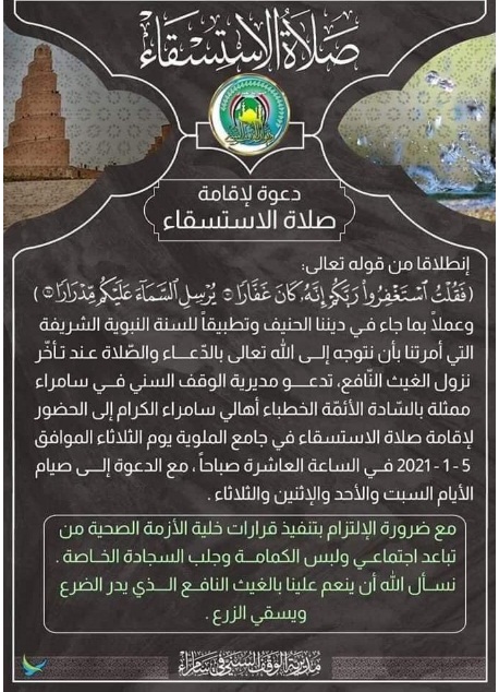 وقالت مديرية الوقف في بيان صحفي تابعته وكالة نون اليوم (5 كانون الثاني 2021): إنه " تنفيذاً لما جاء في كتاب الله وسنته تدعو مديرية الوقف السني في سامراء أهالي المدينة الحضور لاقامة صلاة الاستسقاء".
