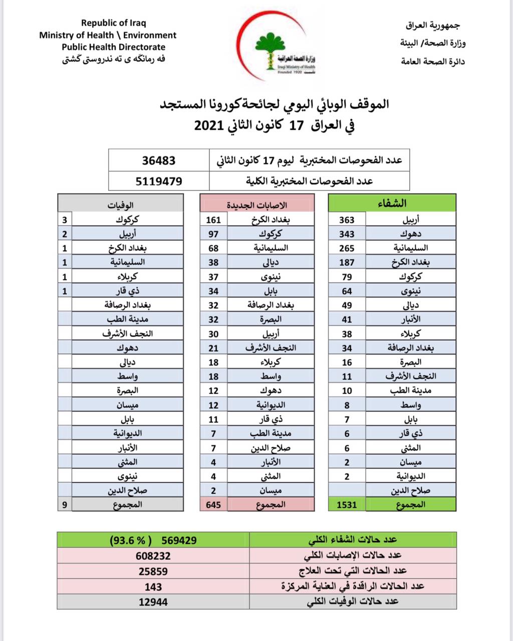 وقالت الوزارة في بيان حصلت وكالة نون الخبرية عليه، إن الموقف الوبائي سجل، اليوم 645 اصابة جديدة، فيما كانت عدد حالات الشفاء 1531 حالة، فيما كانت عدد حالات الوفاة 9 فقط.