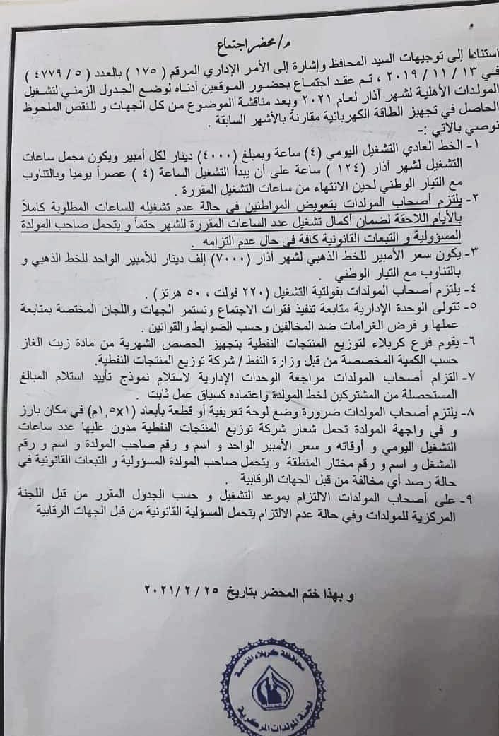 حددت محافظة كربلاء المقدسة سعر ومدة تشغيل المولدات الاهلية لشهر اذار القادم