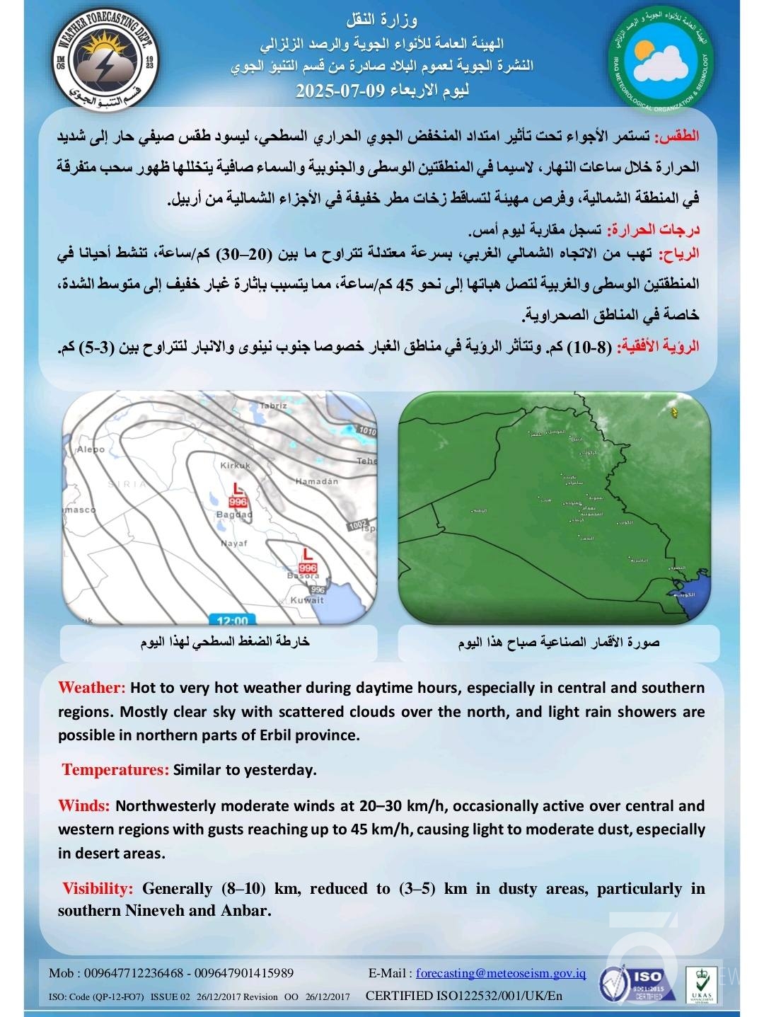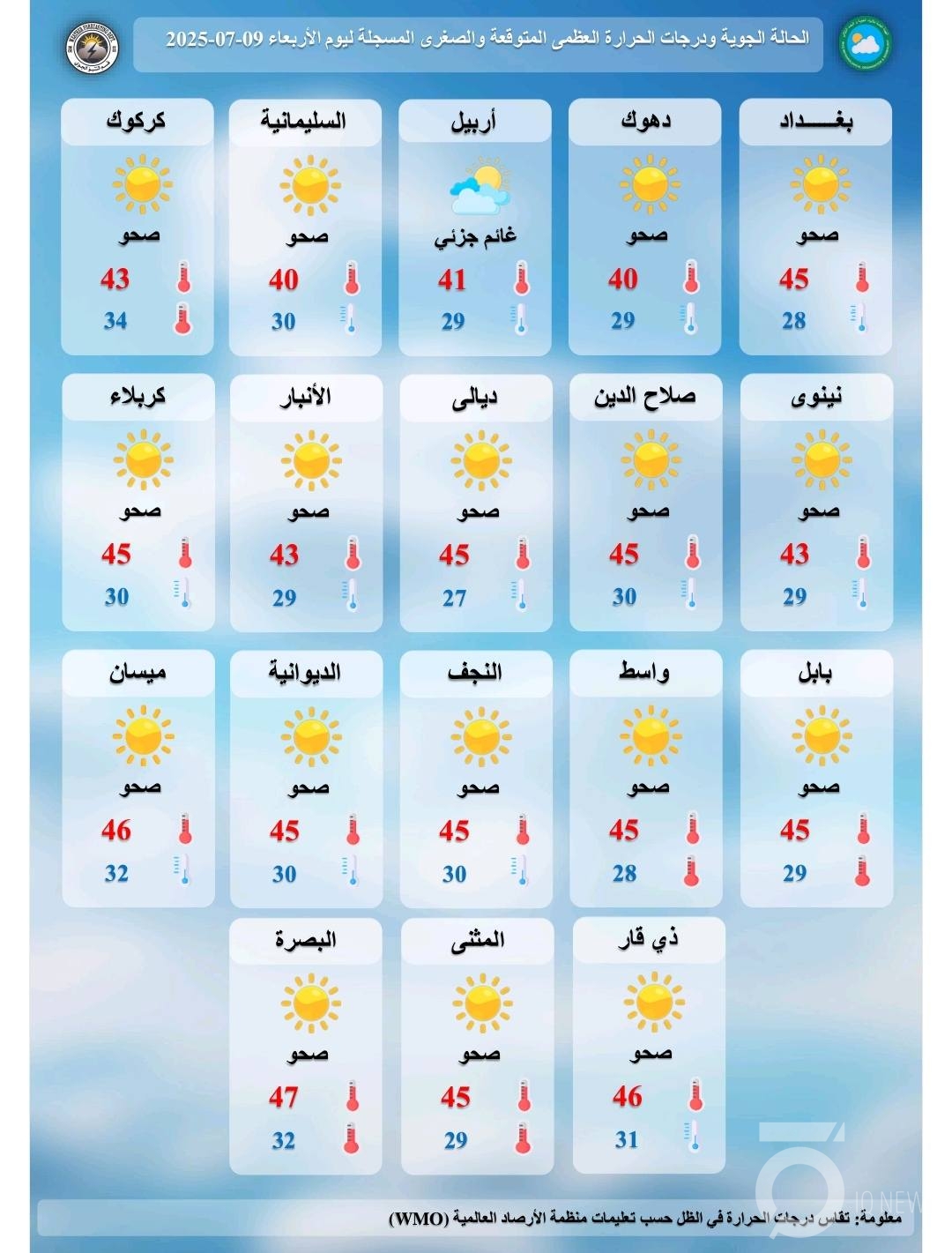 حرّ تموز يبدأ بالارتفاع في العراق الأربعاء 09 تموز 2025 سياسية 1,058 مشاهدة حرّ تموز يبدأ بالارتفاع في العراق أعلنت هيئة الأنواء الجوية، اليوم الأربعاء، حالة طقس العراق خلال الأيام المقبلة كلمات مفتاحية العراق الانواء الجوية عراق ارتفاع #العراق تموز العرا الأنواء الجوية التعليقات (0) لا توجد تعليقات بعد. كن أول من يعلق! اسمك البريد الإلكتروني تعليق إرسال التعليق تعليقاتكم والموضوعات الأكثر تداولاً أكثر المواضيع قراءة عرض الكل الأكثر قراءة اليوم الأسبوع الشهر سنة 1 مقالات حذارِ من الترميز بحرف الـ ( ص) أو (ع) للمعصومين صلوات الله عليهم 1130 مشاهدة --منذ 7 ساعة 2 سياسية الوضع المالي حرج جداً.. السوداني يصارح الإطار والمالكي يرد: أحسنت ولذلك يجب تغييرك 764 مشاهدة --منذ 19 ساعة 3 إقتصادية في ظروف جوية صعبة بلبنان:العتبة الحسينية توزع خامس وجبة من المساعدات على النازحين السوريين غربي بعلبك 610 مشاهدة --منذ 24 ساعة 4 علمية طعام يومي يحمي العظام ويقويها أكثر من الحليب 478 مشاهدة --منذ 9 ساعة 5 أمن ومجتمع الطقس يعطل الدوام الرسمي في محافظة عراقية 418 مشاهدة --منذ 21 ساعة 1 إقتصادية أسعار صرف الدولار مع افتتاح الأسواق في العراق صباح الاثنين 2299 مشاهدة --الأثنين 15 كانون الأول 2025 2 اخبار محلية كربلاء تنتقد قرارات لوزارة الداخلية وتصفها بانها عملية قتل مع "سبق الاصرار" للسياحة بالعراق والمحافظة 2257 مشاهدة --الأثنين 15 كانون الأول 2025 3 إقتصادية تعرف على أسعار صرف الدولار مع اغلاق البورصة مساء الأحد 2161 مشاهدة --الأحد 14 كانون الأول 2025 4 إقتصادية الدولار يواصل ارتفاعه أمام الدينار العراقي مساء السبت 2090 مشاهدة --السبت 13 كانون الأول 2025 1 سياسية مجلس بغداد يُفعّل نظام التوصيل المنزلي للنفط الأبيض 4526 مشاهدة --الخميس 20 تشرين الثاني 2025 2 إقتصادية الدولار يواصل ارتفاعه أمام الدينار العراقي 3439 مشاهدة --الأربعاء 19 تشرين الثاني 2025 3 إقتصادية الدولار يواصل ارتفاعه أمام الدينار العراقي 3289 مشاهدة --الثلاثاء 25 تشرين الثاني 2025 4 سياسية دولة القانون تكشف عن مرشح جديد لرئاسة الوزراء 2887 مشاهدة --الأثنين 24 تشرين الثاني 2025 5 إقتصادية أسعار صرف الدولار مع إغلاق السوق مساء الأربعاء في العراق 2832 مشاهدة --الأربعاء 03 كانون الأول 2025 6 اخبار محلية كربلاء توزع حصة النفط الأبيض بالبطاقة الالكترونية رقم (٢) 2793 مشاهدة --الثلاثاء 18 تشرين الثاني 2025 1 اخبار محلية خلال زيارته لمشروع صحن العقيلة.. ممثل السيد السيستاني يوعز بتخصيص مساحة (5) الاف متر على اسطح البنايات للزائرين 18736 مشاهدة --السبت 13 ايلول 2025 2 سياسية مكتب السيد السيستاني ينشر إمساكيات شهر رمضان المبارك للمحافظات العراقية لعام 1446هـ (2025م) 14034 مشاهدة --الأربعاء 19 شباط 2025 3 لقاءات *محمد الصواف: عدسة توثق الحقيقة وتنقل قصص الإنسانية في قلب الأزمات* 12646 مشاهدة --الأحد 30 آذار 2025 4 لقاءات منها الخاصة وفوق الكبرى والكبرى.. حيدر زيني.. طبيب أجرى (51) عملية في (28) ساعة متواصلة بمستشفى السفير 11272 مشاهدة --الثلاثاء 27 آيار 2025 5 اخبار محلية كربلاء تحدد تسعيرة "أمبير" المولدات الأهلية لشهر حزيران 2025 9845 مشاهدة --الثلاثاء 27 آيار 2025 6 تحقيقات بينَ زَخَّاتِ الرَّصاصِ وَدُموعِ الأهلِ.. قِصةُ شهيدٍ كَتبَتْ كربلاءُ خاتِمَتَهُ 9264 مشاهدة --الأربعاء 02 نيسان 2025 آخر التعليقات 1 طالب عبدالله حسين التعليق : اريد هذا الكتاب كامل ... الموضوع : قراءة في كتاب تاريخ الشطرة خلال العهد العثماني دراسة.د . شاكر الشطري 2 قيس الشاهين التعليق : وفق الله الجميع لما فيه خير وصلاح هذه الامة وجزى الله المنقذموظف الغابة العباسبة المقدسة ... الموضوع : منتسب بالعتبة العباسية ينقذ طفلا تائها في منطقة صحراوية بمحافظة ميسان 3 Alshereffy Najim التعليق : أنا من اشد المعجبين في هذا الرافد. العراقي الجبل الشاهق اتمنى لو كان حي يرو ... الموضوع : الجواهري يرد على صدام حسين سل مضجعيك يابن الزنا (نص كامل) 4 امجد محمد نجيب ابراهيم زيوري...بغداد.. التعليق : سلام عليكم رحمة الل