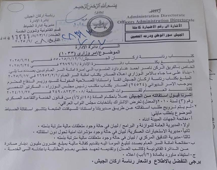 وجاء في وثيقة نشرتها صحيفة "العالم الجديد"، أن الفريق الركن ناصر الغنام، قدم استقالته من الجيش العراقي، وذلك بسبب ترشحه واشتراكه في الانتخابات البرلمانية المقبلة.