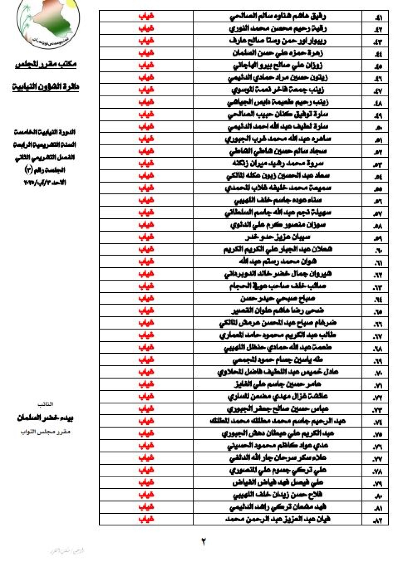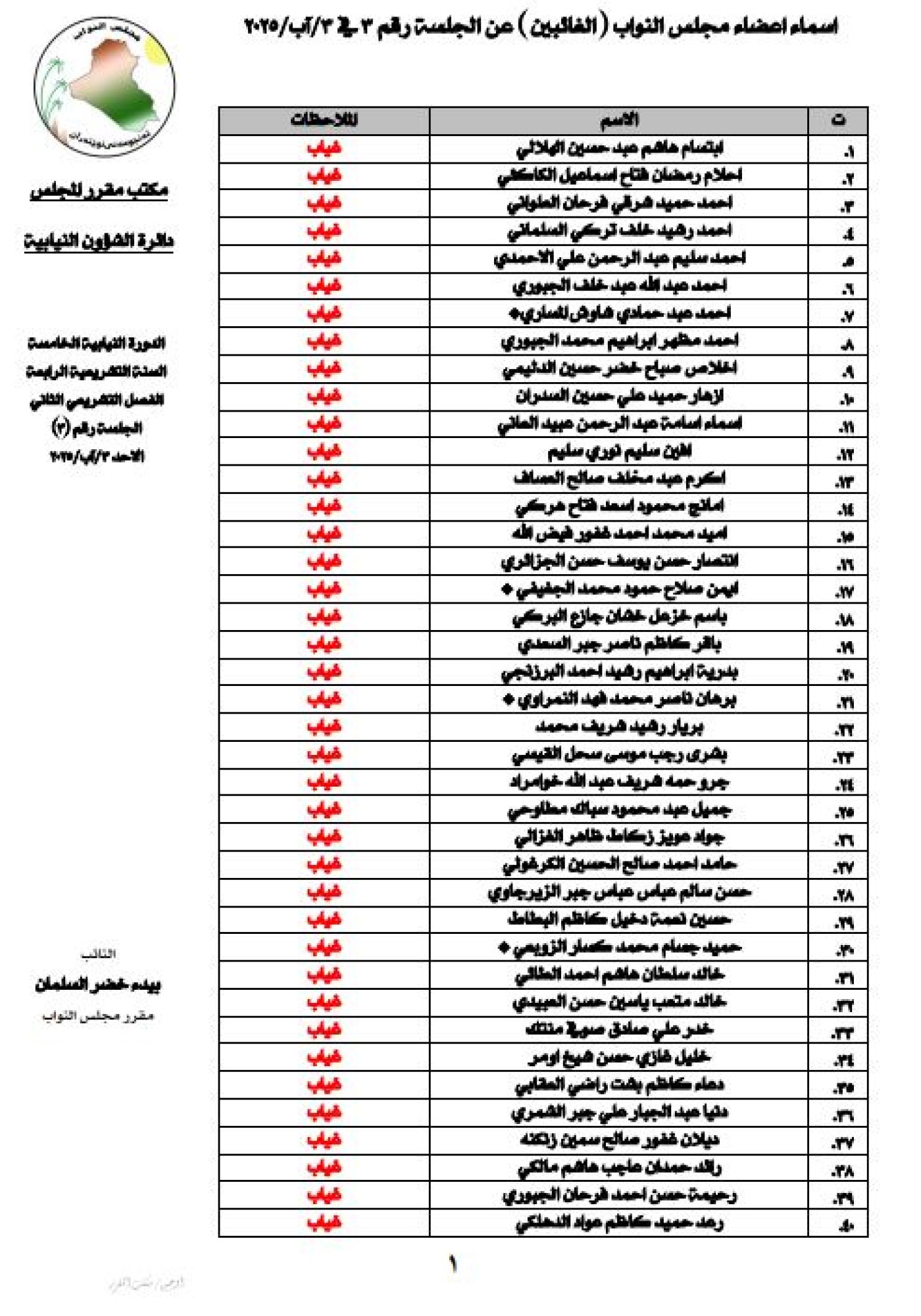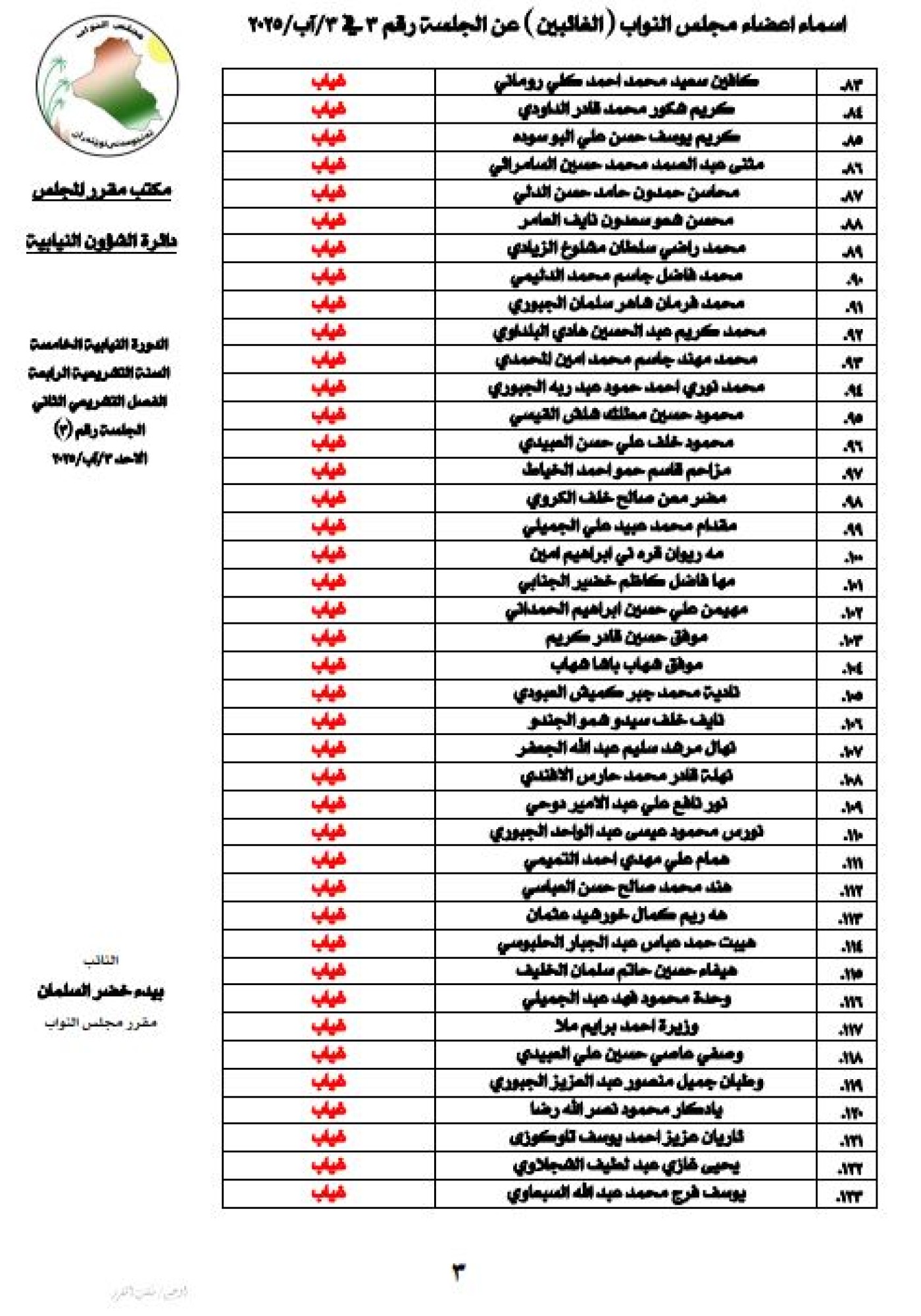 أعلنت رئاسة مجلس النواب العراقي، الأحد 3 آب 2025، اسماء أعضاء المجلس المتغيبين عن جلسة المجلس لهذا اليوم.
