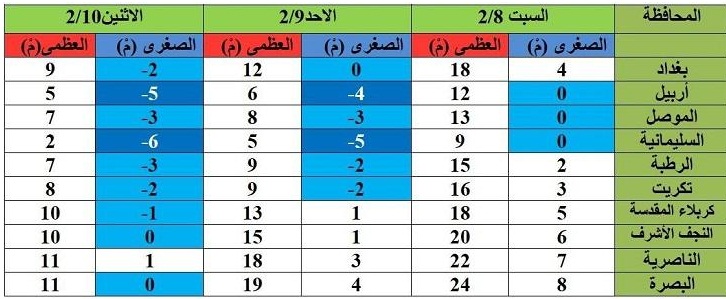 كما نشرت جدولاً بدرجات الحرارة الصغرى والعظمى المتوقعة للأيام الثلاثة المقبلة