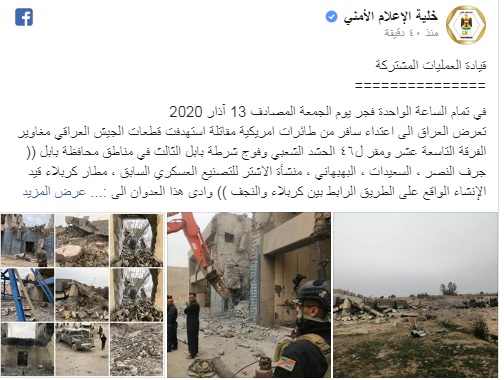 وقالت قيادة العمليات المشتركة، في بيان أصدرته اليوم الجمعة: "في تمام الساعة الواحدة فجر يوم الجمعة المصادف 13 آذار (مارس) 2020 تعرض العراق إلى اعتداء سافر من طائرات أمريكية مقاتلة استهدفت قطعات الجيش العراقي مغاوير الفرقة الـ19 ومقر الـ46 الحشد الشعبي وفوج شرطة بابل الثالث في مناطق محافظة بابل (جرف النصر، السعيدات، البهبهاني، منشأة الأشتر للتصنيع العسكري السابق، مطار كربلاء قيد الإنشاء الواقع على الطريق الرابط بين كربلاء والنجف)".
