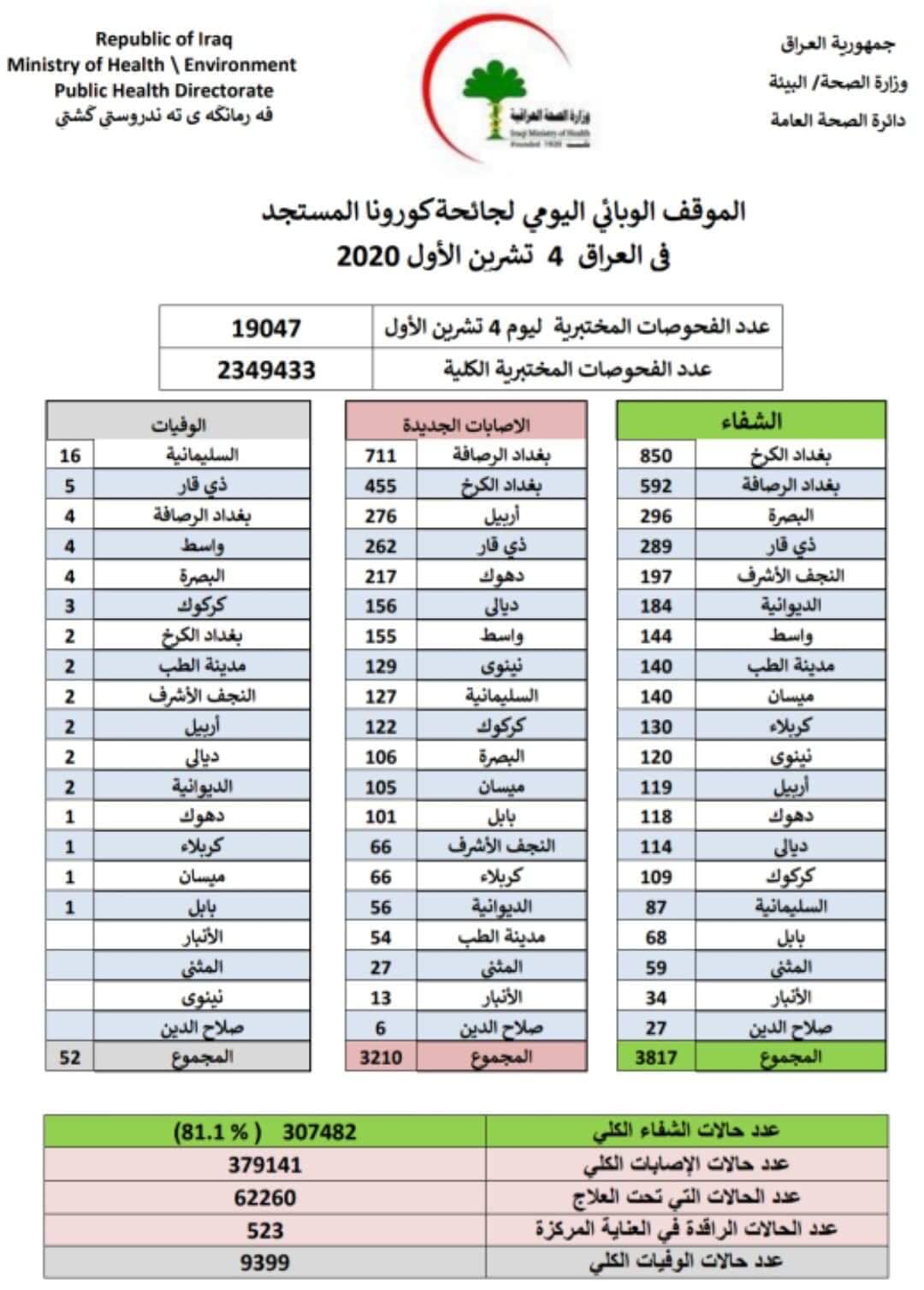 وسجلت مختبرات وزارة الصحة، 3817 حالة شفاء خلال يوم واحد، مما يرفع إجمالي حالات الشفاء من الفيروس التاجي إلى 307482 حالة منذ ظهور الوباء في العراق، بحسب البيان.