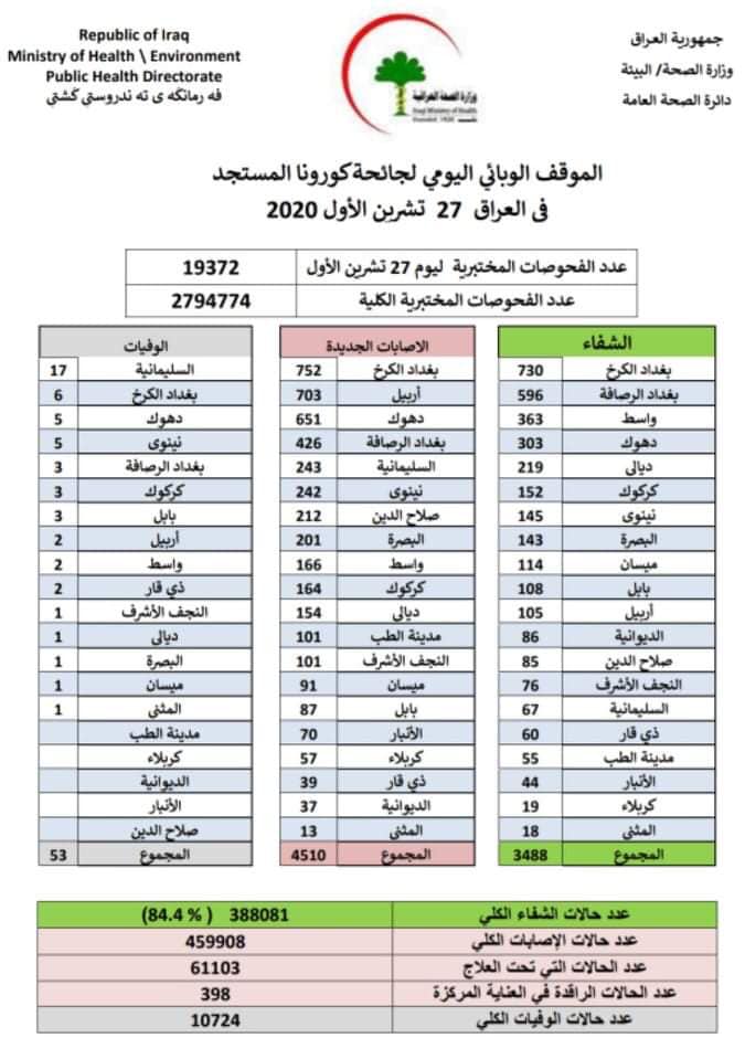 كورونا :اكثر من 4500 اصابة بالعراق والمحافظات الشمالية الثلاث تسجل 1597 اصابة (بالجدول )