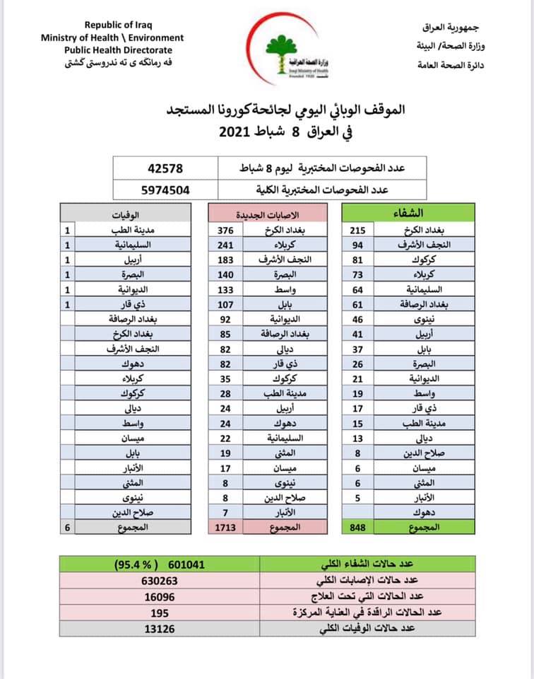 أعلنت وزارة الصحة والبيئة العراقية، اليوم الاثنين، عن تسجيل 1713 إصابة جديدة بفيروس كورونا وشفاء 848 حالة فيما سجلت محافظة كربلاء المقدسة ارتفاعا كبيرا بالاصابات فاق حالات الشفاء .
