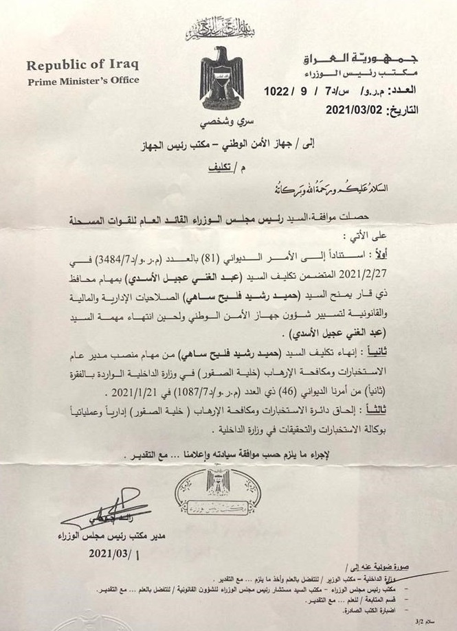 وبحسب وثيقة صادرة من مكتب رئيس الوزراء، فقد اوكل رئيس الوزراء مصطفى الكاظمي مهمة الجهاز مدير عام الاستخبارات ومكافحة الارهاب في خلية الصقور التابعة لوزارة الداخلية حميد رشيد فليح ساهي بدلا من الاسدي على ان تلتحق دائرة الاستخبارات ومكافحة الارهاب في خلية الصقور اداريا وعملياتيا بوكالة الاستخبارات والتحقيقات في وزارة الداخلية.