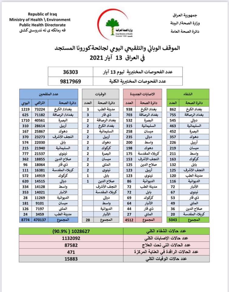 تنشر وكالة نون الخبرية الموقف الوبائي والتلقيحي اليومي لجائحة كورونا في العراق ليوم الخميس الموافق ١٣ ايار ٢٠٢١