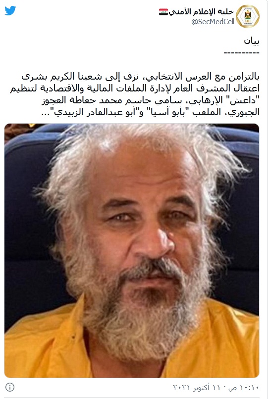 وقال الكاظمي في تغريدة على حسابه في موقع تويتر: " في الوقت الذي كانت عيون أبطالنا في القوات الأمنية يقظة لحماية الانتخابات، كانت ذراعهم الأصيلة في جهاز المخابرات تنفذ واحدة من أصعب العمليات المخابراتية خارج الحدود، للقبض على المدعو سامي جاسم، مشرف المال لداعش"