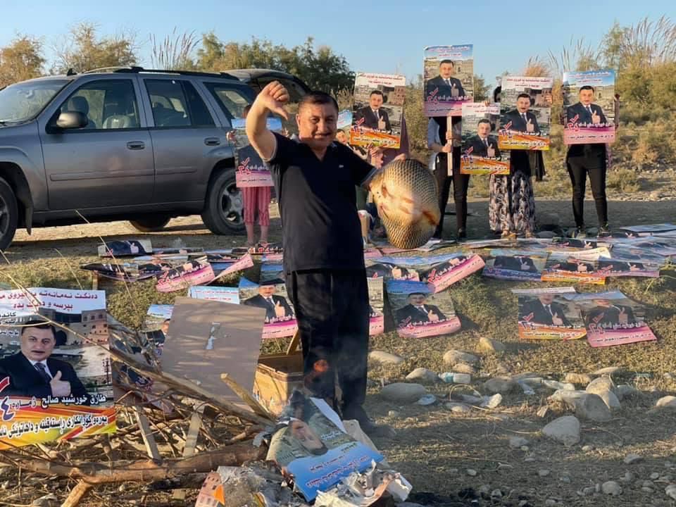 إذ اقدم المرشح المستقل "طارق خورشيد"، وبعد سماعه اعلان نتائج الانتخابات وتيقنه بالخسارة، على رفع صوره الاعلانية للانتخابات واستخدامها كفحم لشواء السمك في احدى مناطق اربيل.