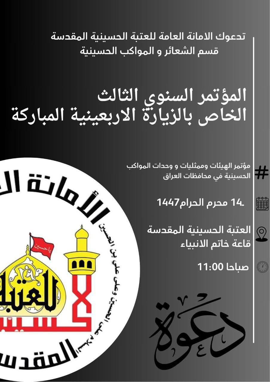 وجهت الامانة العامة للعتبة الحسينية المقدسة دعوتها لكافة الهيئات وممثليات ووحدات المواكب في عموم العراق لحضور المؤتمر السنوي الثالث الخاص بزيارة الاربعين المباركة.