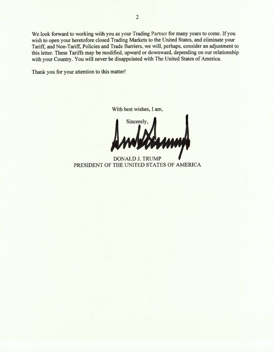 واستطرد بالقول: “نتطلع للعمل معكم كشريك تجاري لسنوات عديدة قادمة، إذا رغبتم في فتح أسواقكم التجارية المغلقة أمام الولايات المتحدة، والقضاء على سياسات الرسوم الجمركية وغير الجمركية، فسنقوم -ربما- بمراجعة محتوى هذه الرسالة”.