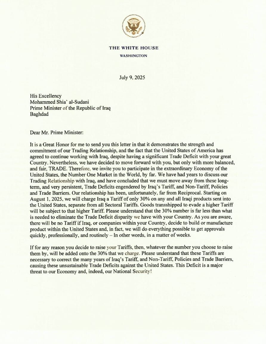 ولفت إلى أنه “إذا قررتم، لأي سبب، رفع الرسوم الجمركية على منتجاتنا، فإن أي نسبة تضيفونها ستُضاف إلى نسبة الـ30٪ التي نفرضها، نرجو أن تفهموا أن هذه الرسوم ضرورية لتصحيح سنوات من السياسات الجمركية وغير الجمركية العراقية التي أدت إلى عجز تجاري غير مستدام مع الولايات المتحدة”، مؤكدا أن “هذا العجز يُشكّل تهديدا خطيرا على اقتصادنا، بل وعلى أمننا القومي”.