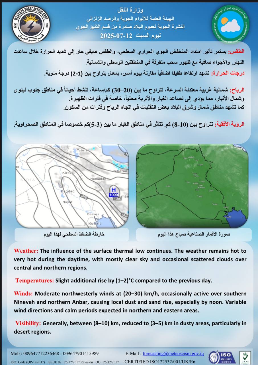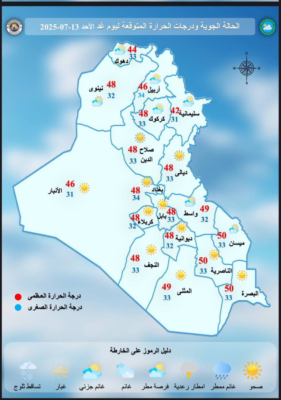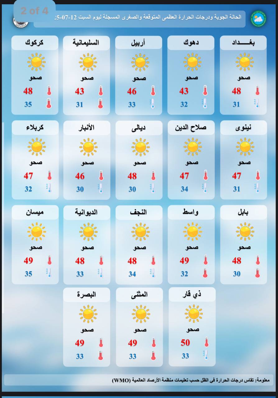 ونشرت الهيئة درجات الحرارة العظمى المتوقعة ليوم السبت، والتي أظهرت تسجيل بغداد 48 درجة، دهوك 43، أربيل 46، السليمانية 43، كركوك 48، صلاح الدين 47، ديالى 48، الأنبار 46، كربلاء 47، بابل 48، واسط 49، النجف 48، الديوانية 48، ميسان 49، ذي قار 50، المثنى 49، والبصرة 49 درجة مئوية.