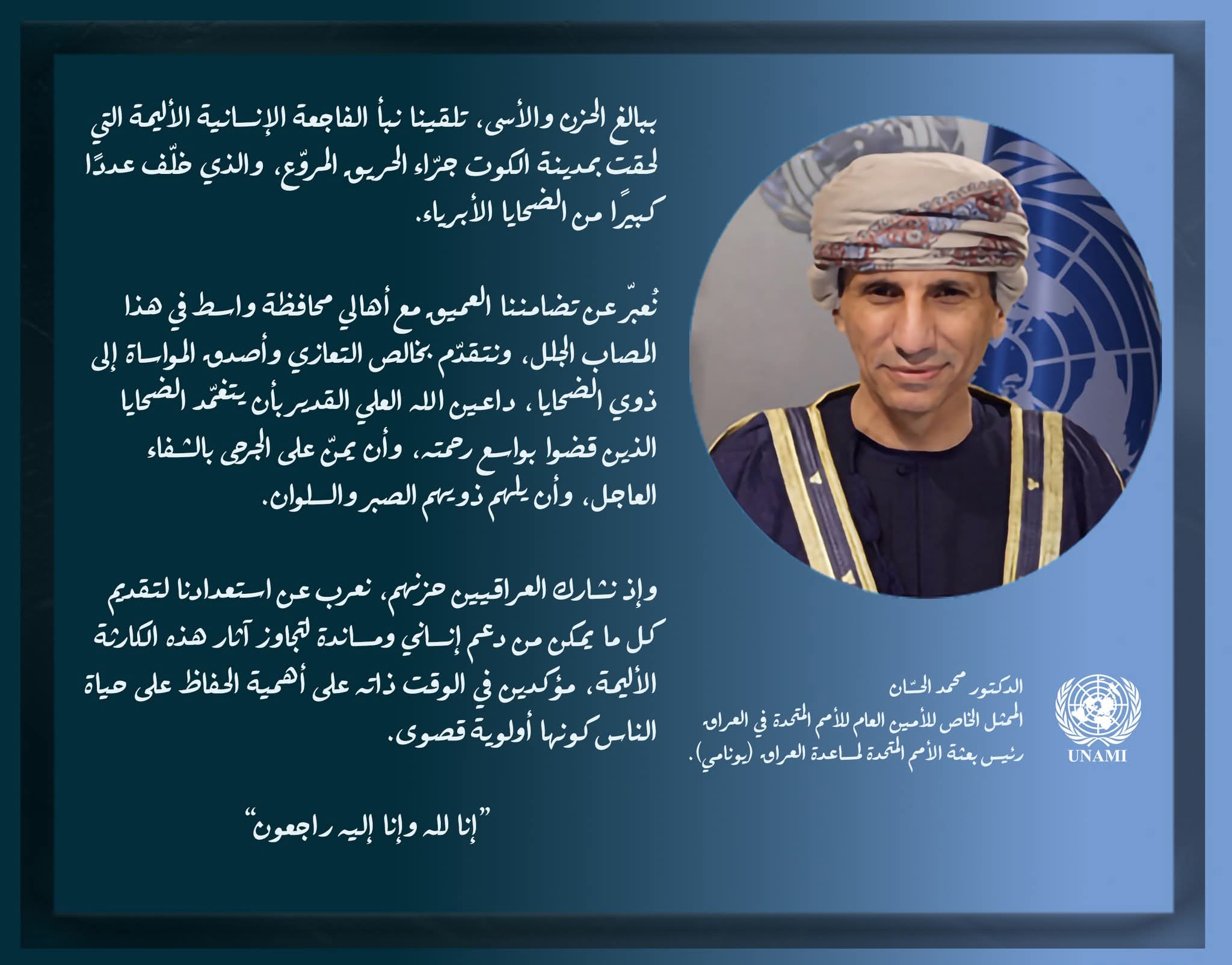 أعلن الممثل الخاص للأمين العام للأمم المتحدة في العراق محمد الحسّان، اليوم الخميس، استعداد البعثة لتقديم الدعم الإنساني والمساندة لتجاوز آثار كارثة حريق الكوت.