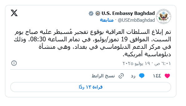 السفارة الأمريكية في بغداد تعلن عن تفجير مسيطر عليه داخل منشأتها الدبلوماسية