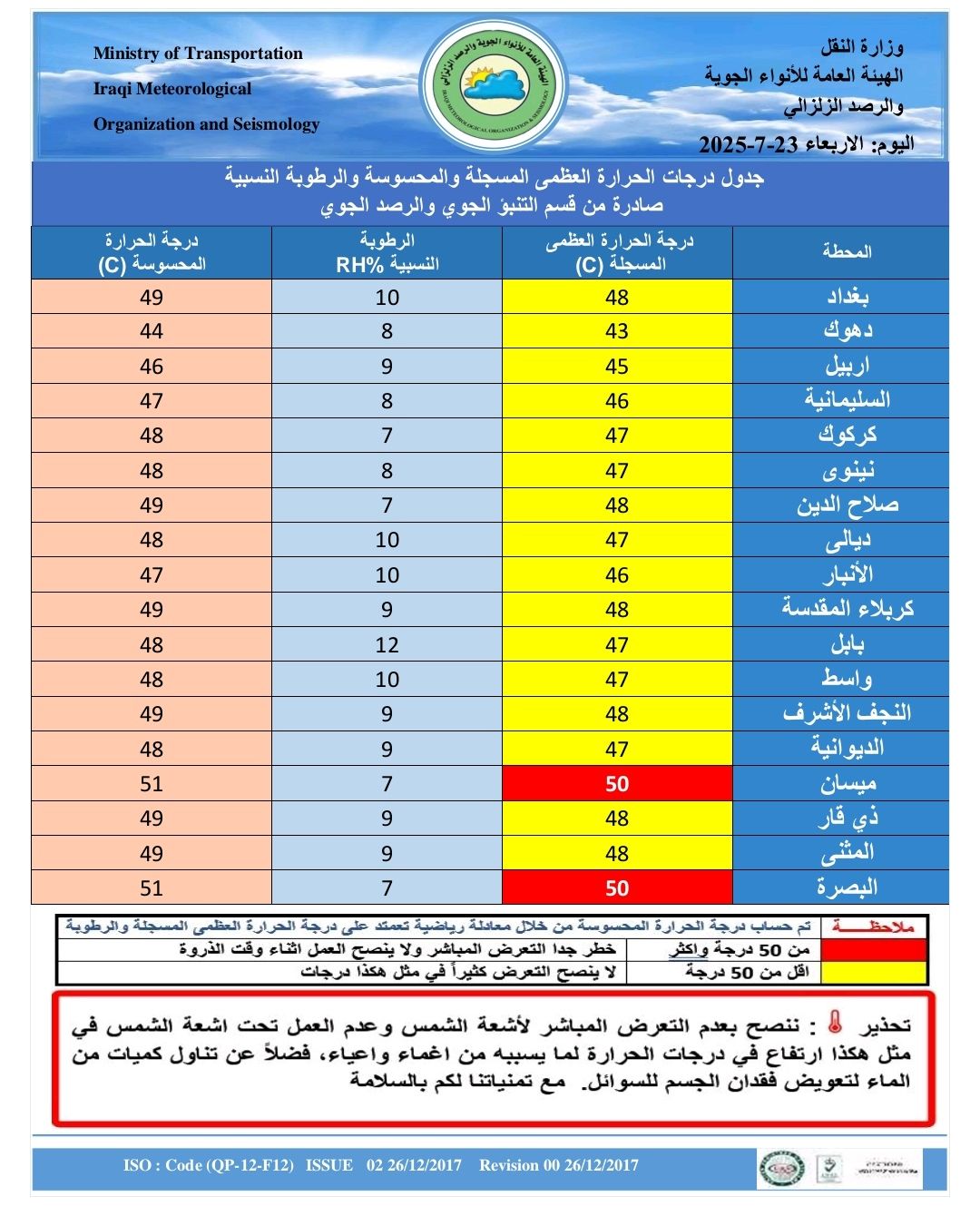 وأظهر جدول لدرجات الحرارة العظمى المسجلة والمحسوسة والرطوبة النسبية الصادر عن الهيئة العامة للأنواء الجوية والرصد الزلزالي، تسجيل محافظتي ميسان والبصرة 50 درجة مئوية.